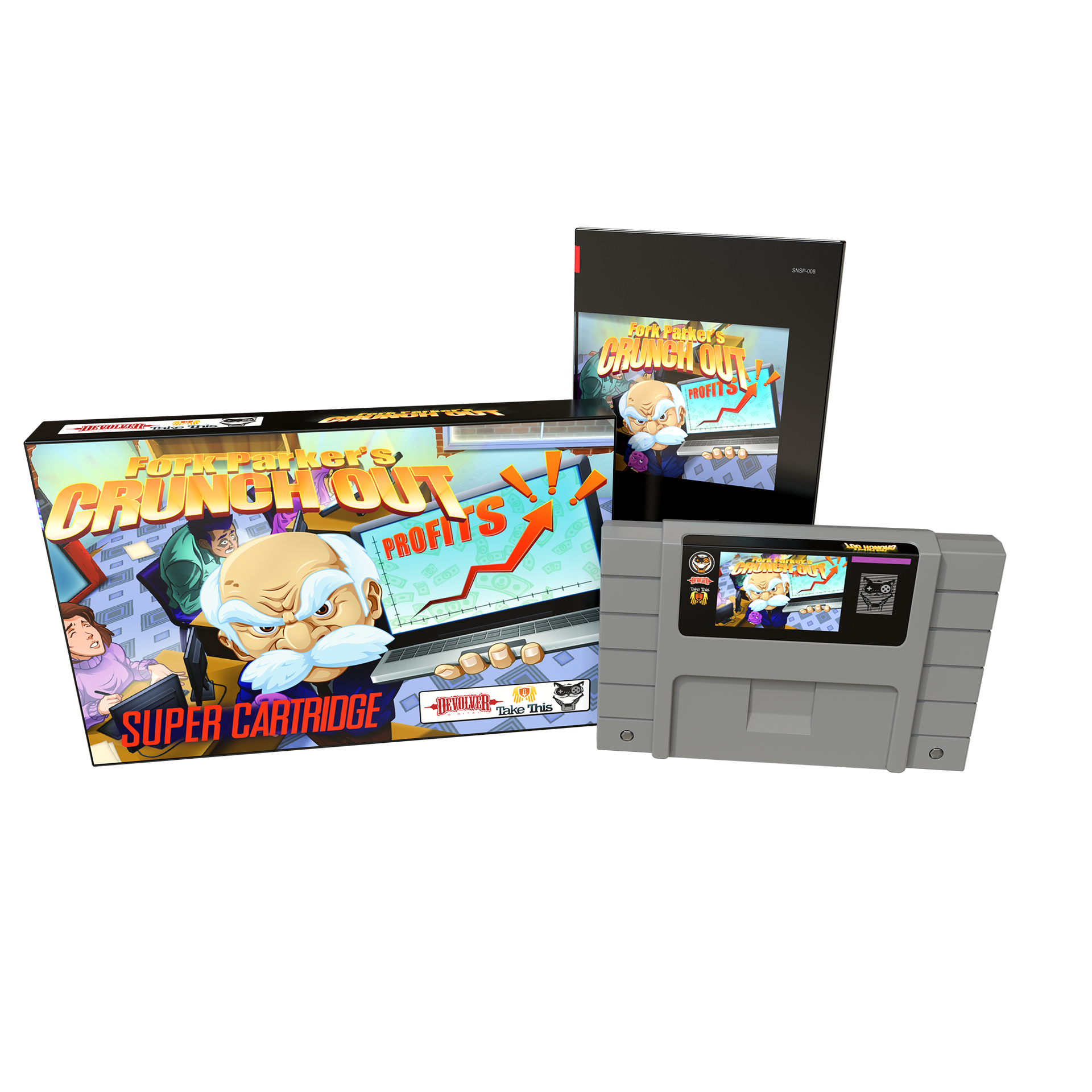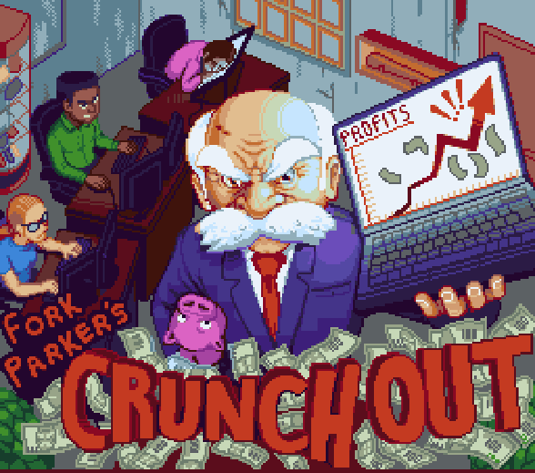 Fork Parker's Crunch Out is a collaboration between Mega Cat Studios, Devolver Digital, and Take This for the label's first-ever Super Nintendo Entertainment System release starring the company's larger than life CFO, Fork Parker. The game aims to raise awareness of the all too real issue of game dev crunch through a playful look at the pressures of game development, exaggerated by the menace that is a game publisher executive.